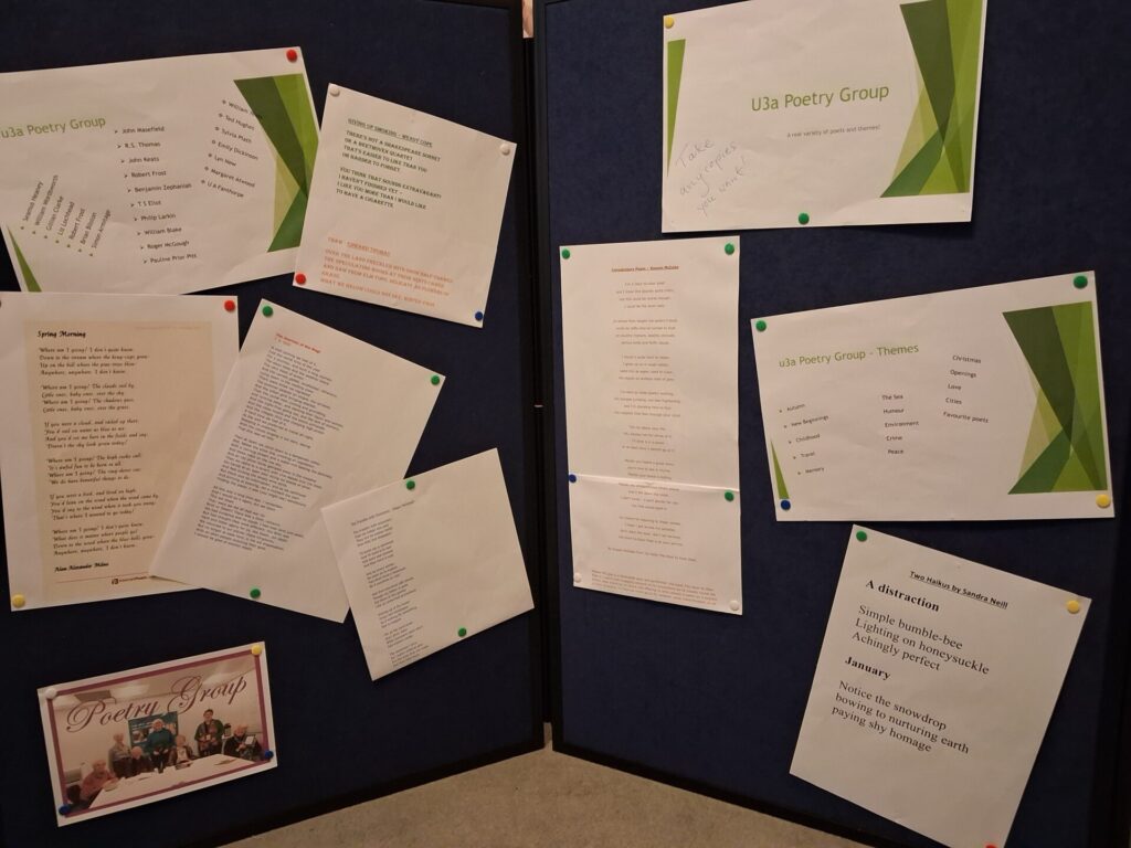 This photograph below is the display produced for the January meeting. It reflects the wide range of poets and styles considered at our meetings, enabling members to appreciate examples of the poems and themes discussed.